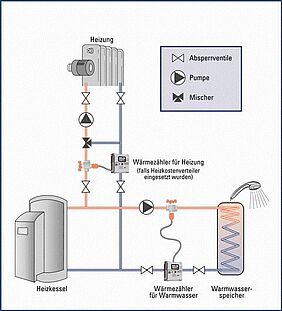 Der Wärmezähler für die Warmwasserbereitung (WWB) wird in die Speicherladeleitung zwischen Heizkessel und Warmwasserspeicher eingebaut (siehe Bild). Beim Einsatz von Heizkostenverteiler wird zur exakten Kostentrennung ein zusätzlicher Wärmezähler für die Erfassung der Heizungsenergie empfohlen.